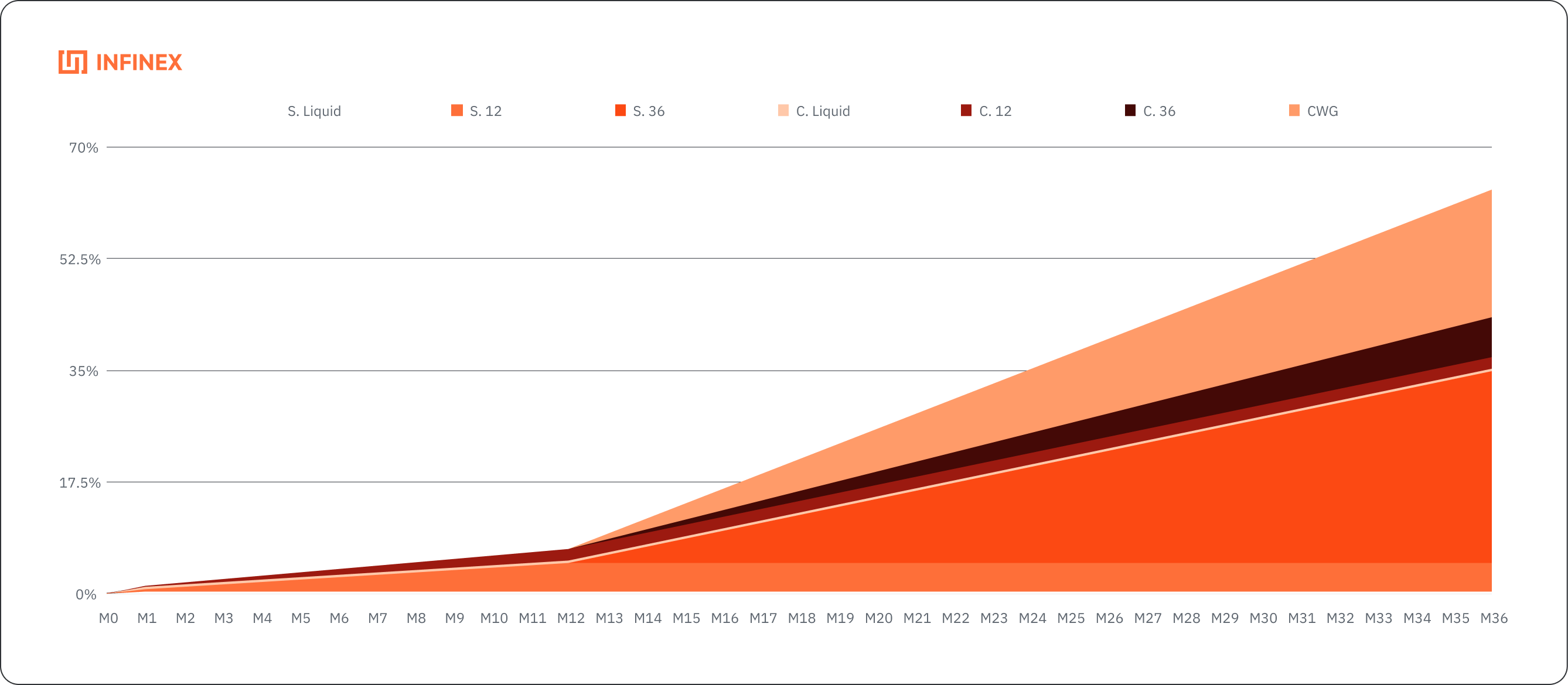 Below is a liquidity schedule based on the number of Patrons purchased in each tier (Unlocked, Linear, Locked) and when the Patrons become moveable.